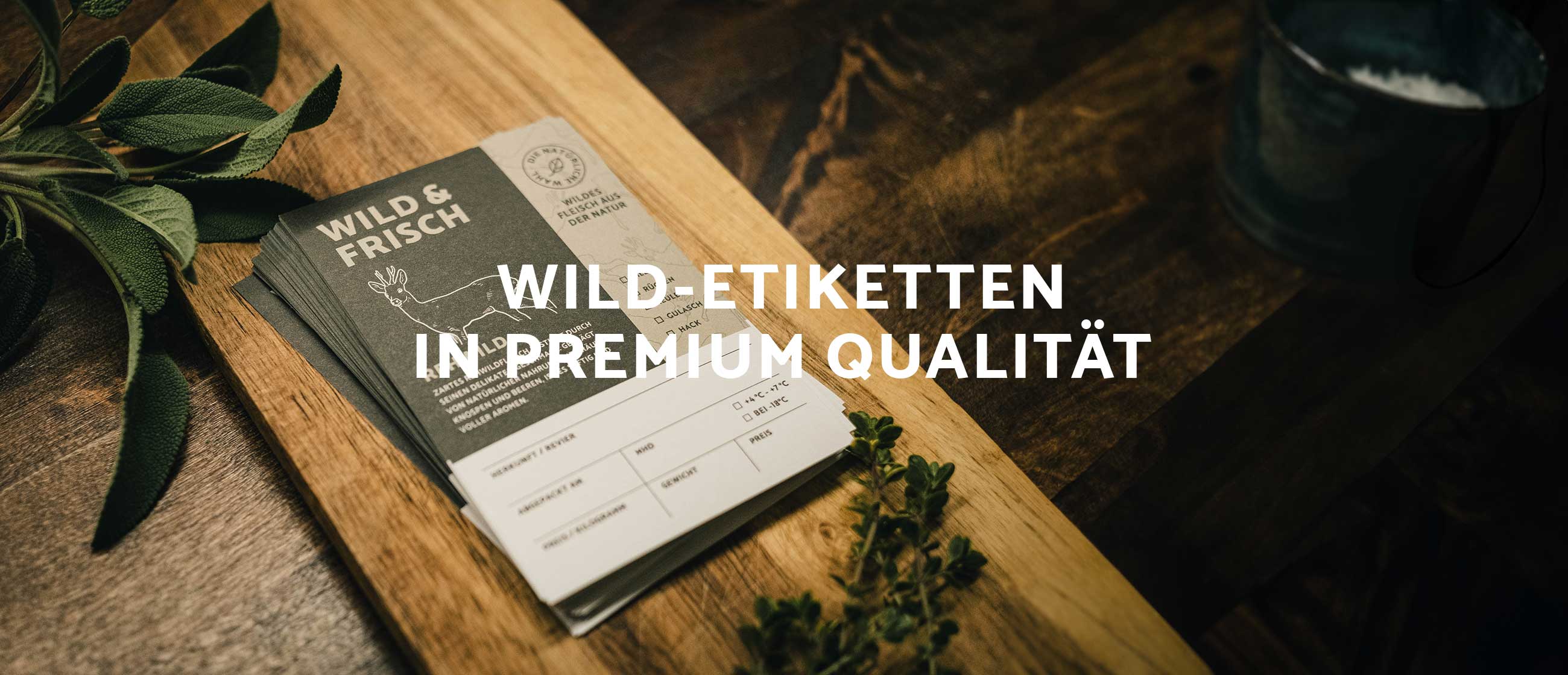 Mit Premium Wild-Etiketten die dem Kunden die Hingabe, die wir in die Hege und Pflege unseres Wildes investieren, die langen Stunden des Ansitzes und die Dankbarkeit für dieses natürliche Premium-Lebensmittel auch in der Vermarktung verdeutlichen.